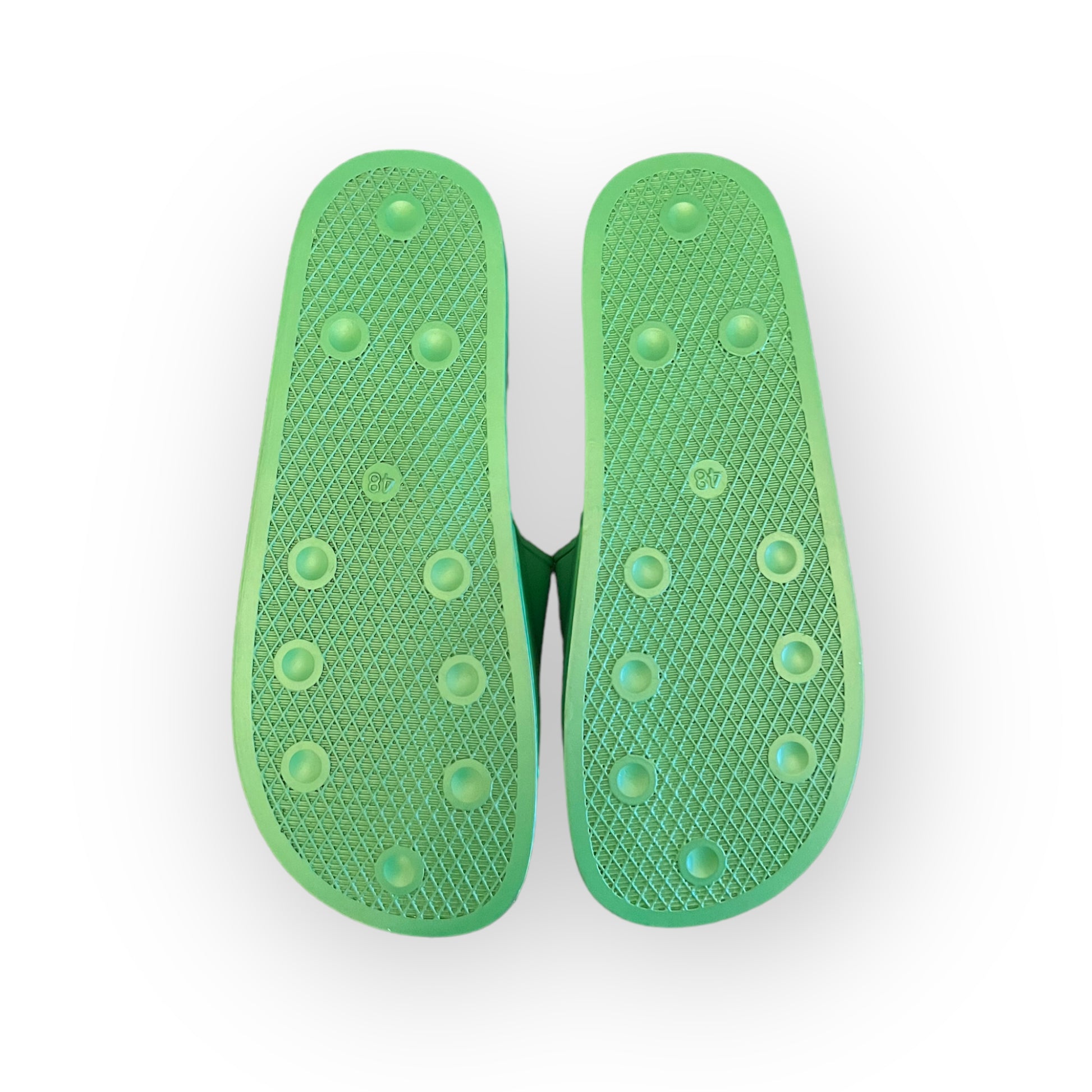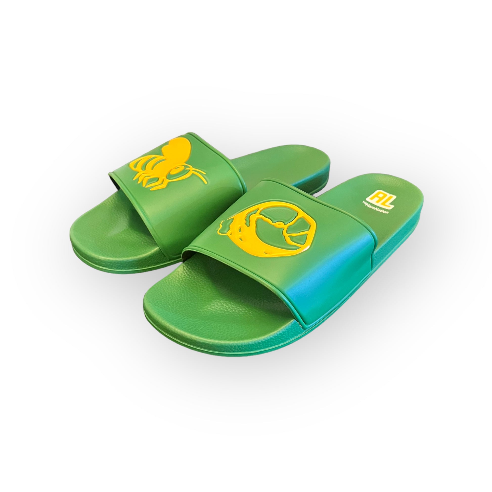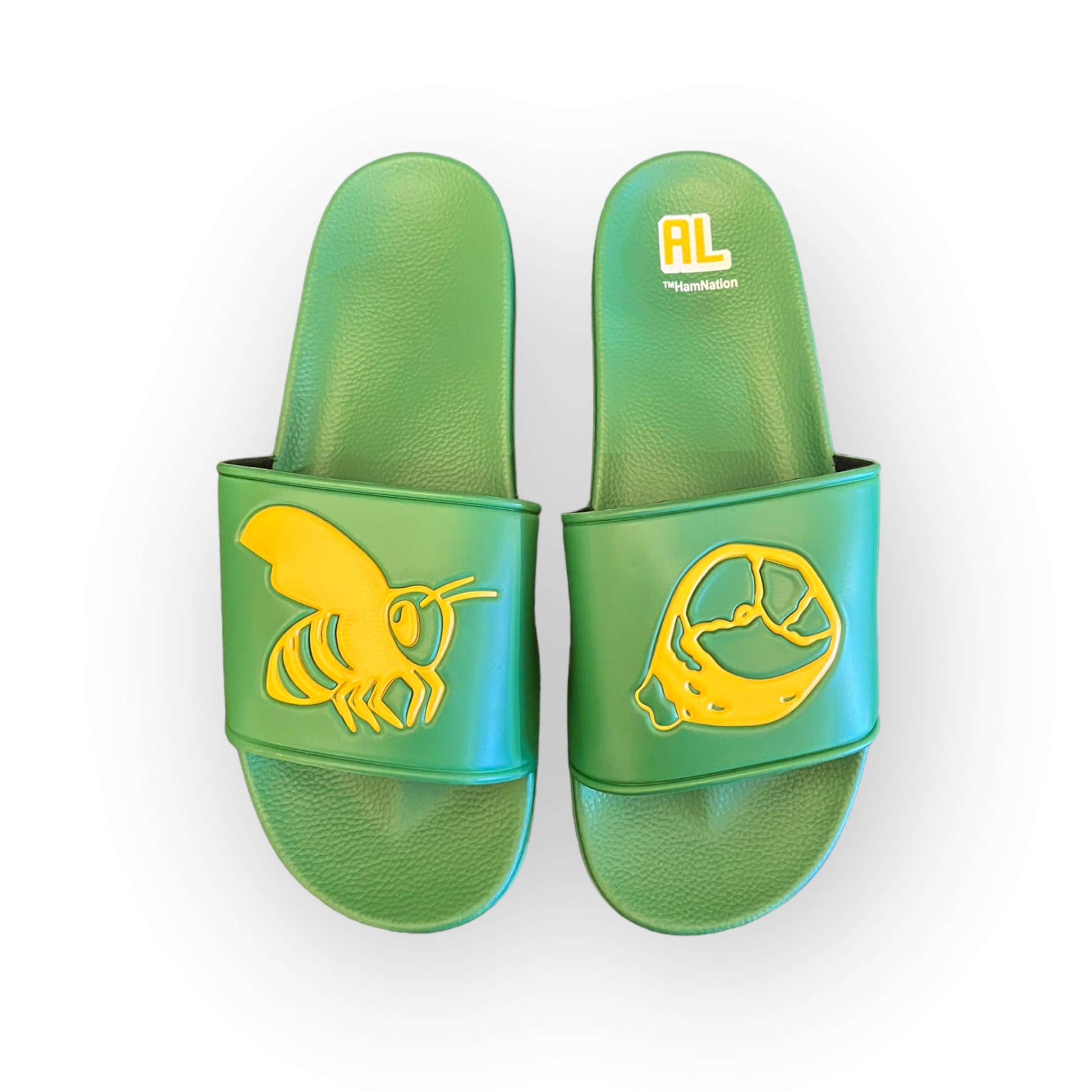 Comfy slides in green and yellow color way, embossed with our "BEE-HAM" logo.