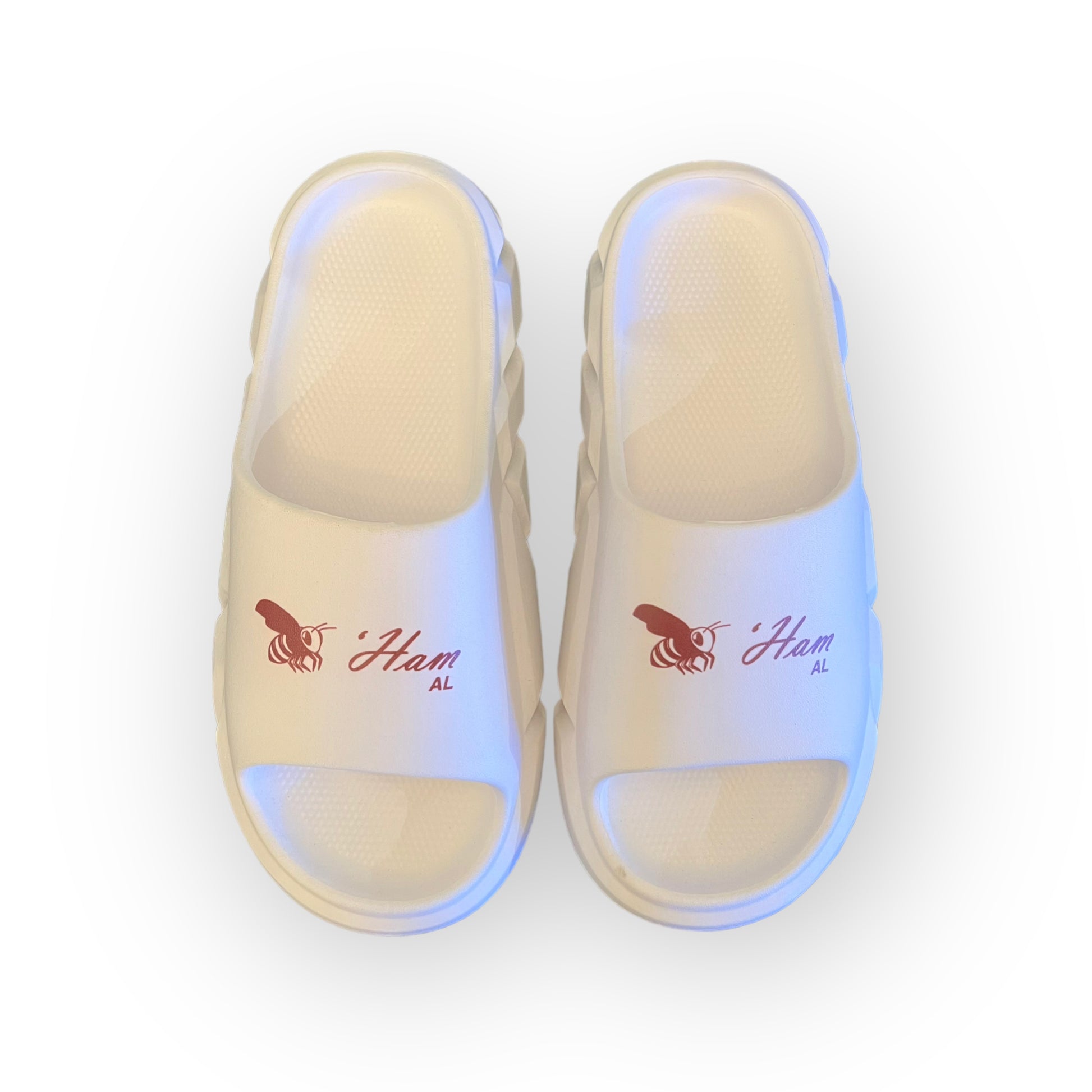 Comfy slides in white and red color way, embossed with our "Bee-Ham" logo.