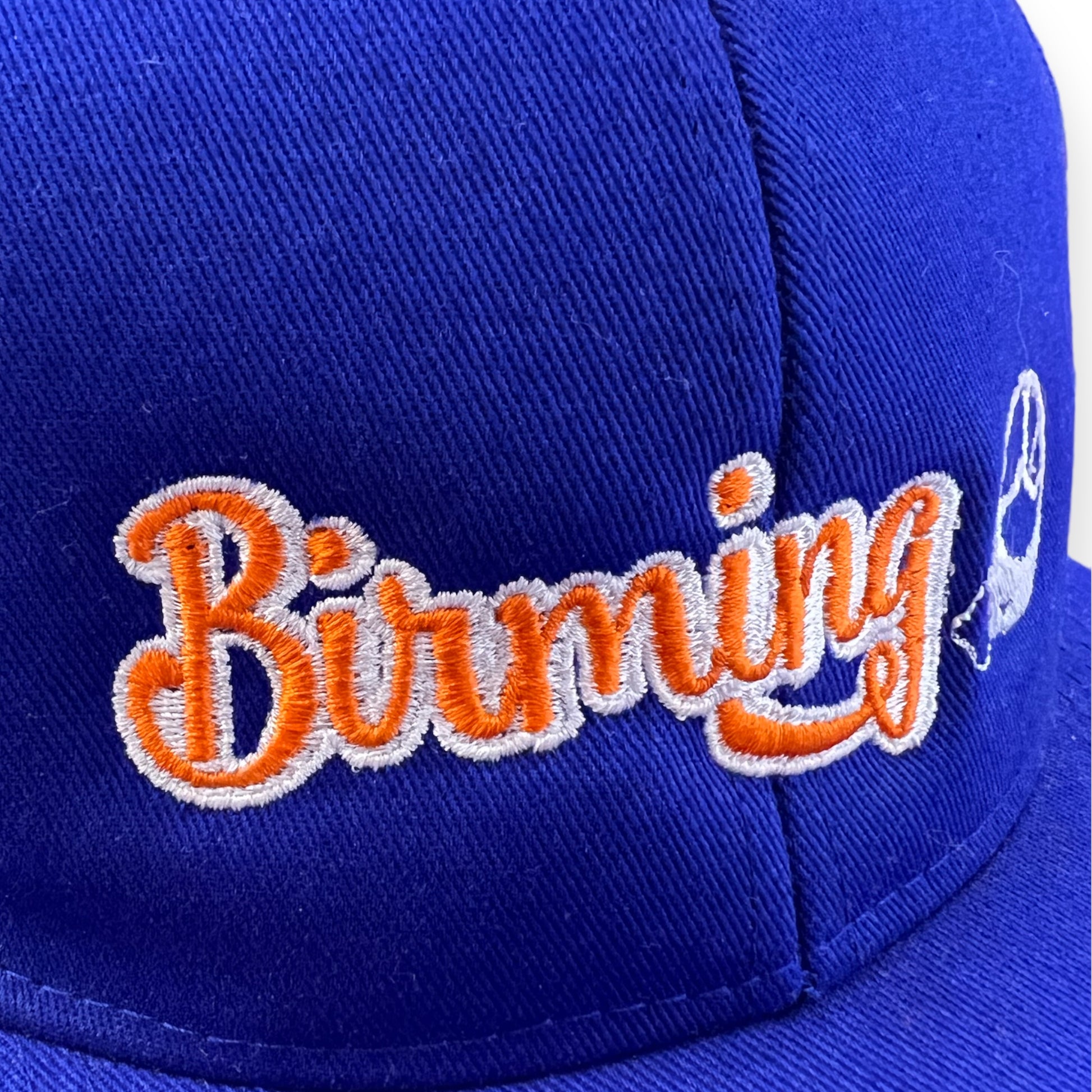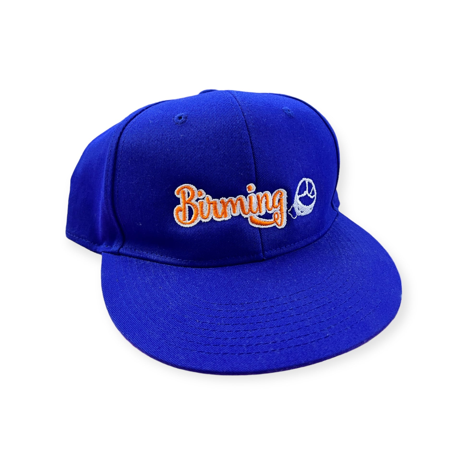 Stay stylish with the Birming-HAM Hat! Featuring orange and white embroidery on a sleek blue background, this snapback cap is both eye-catching and practical with its easy snapback adjustment. One size fits most, making it the perfect addition to any wardrobe.