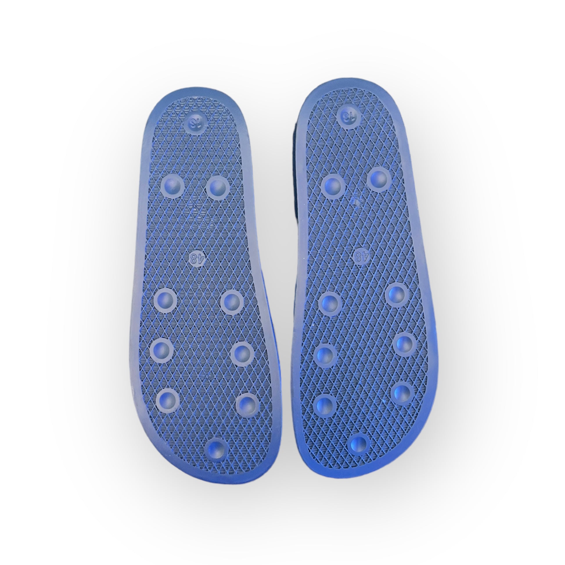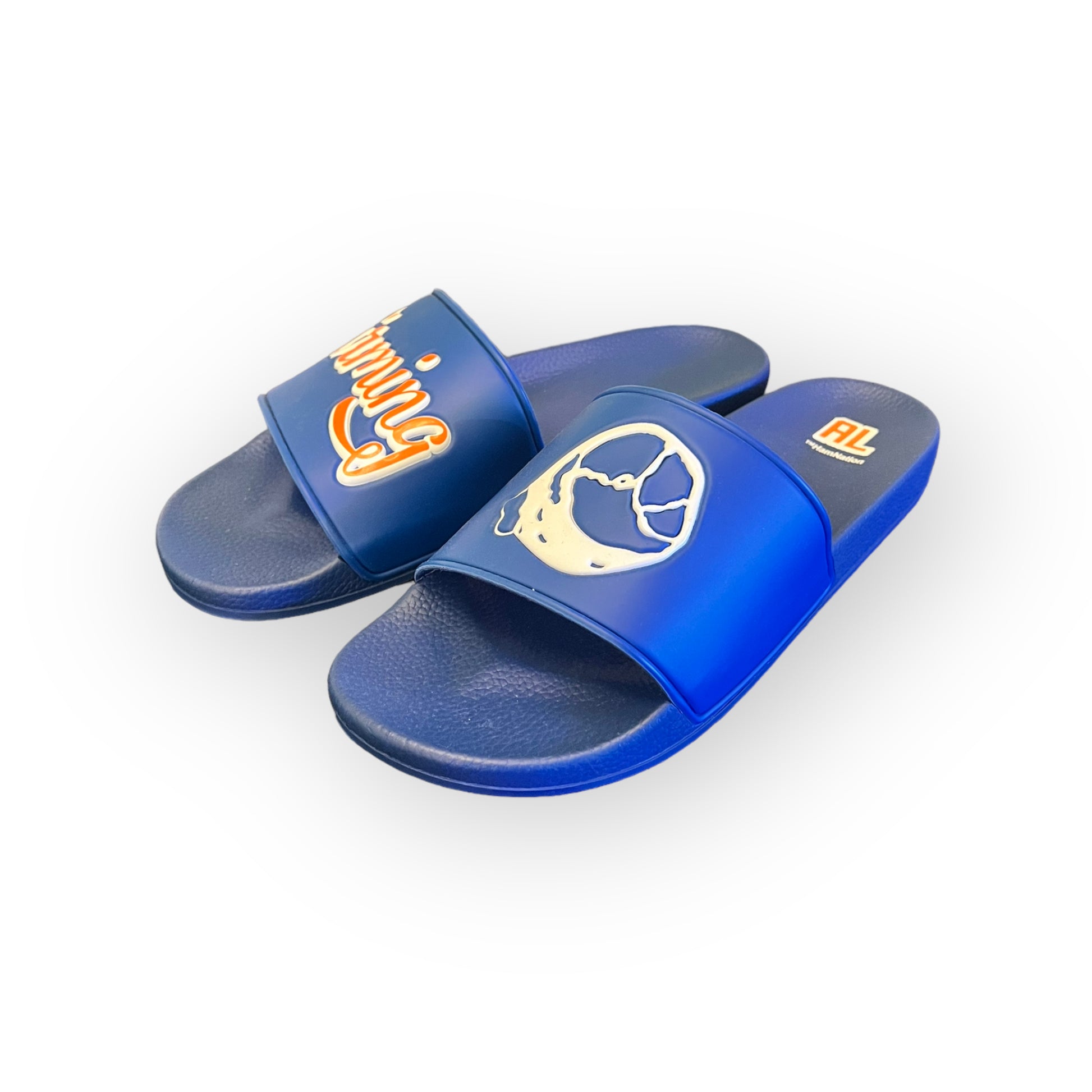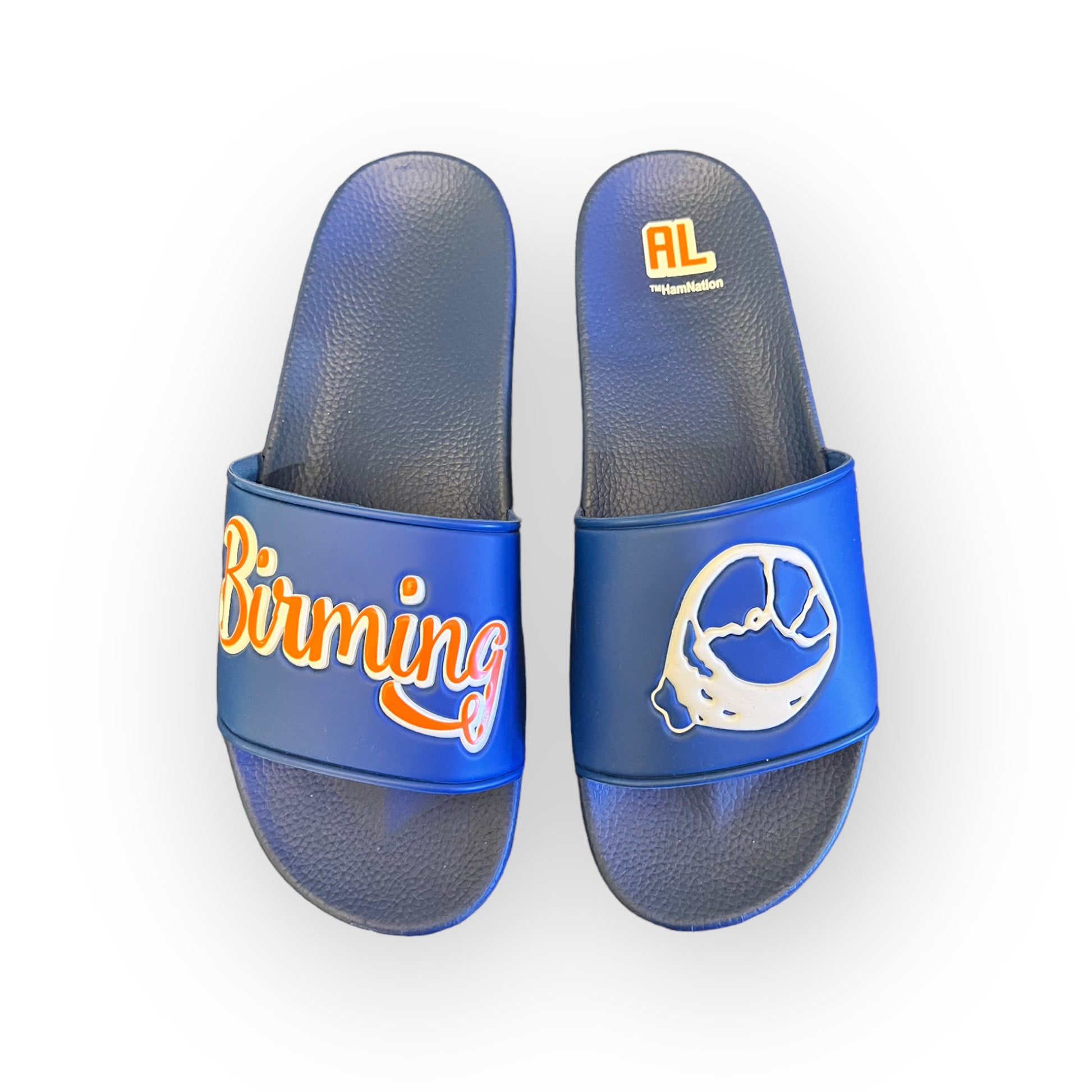 Comfy slides in orange and blue color way, embossed with our "Birming-HAM" logo.